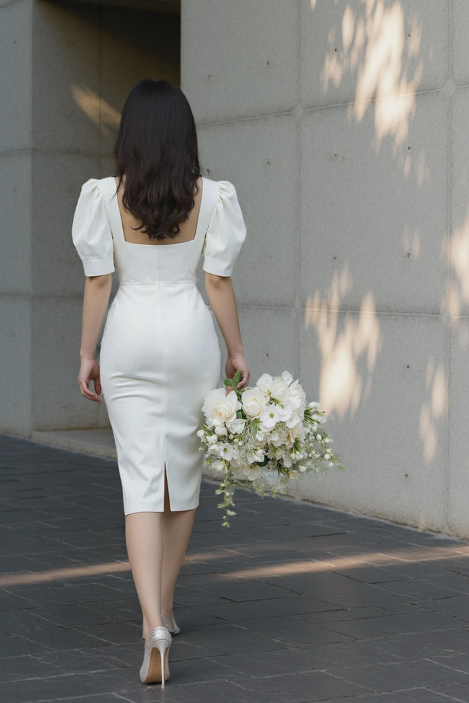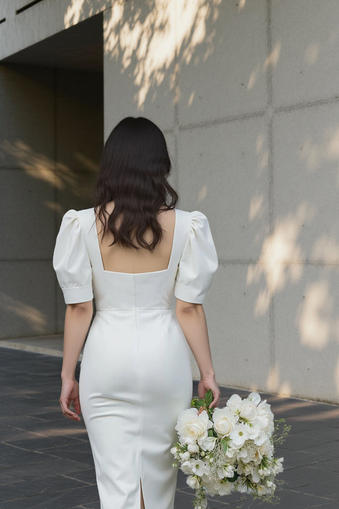 Looking for a chic and cheap wedding dress alternative? This stunning short wedding dress is the perfect choice! This bodycon engagement dress features a modern square neckline and elegant sleeves, providing a sophisticated, figure-hugging silhouette. Ideal for an engagement party, registry office ceremony, or rehearsal dinner, this dress offers stylish appeal without breaking the bank.