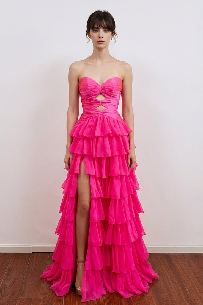 Make a vibrant statement in this hot pink prom dress. This pretty prom dress features a unique keyhole neckline, elegant pleated detailing, and playful ruffles for a touch of drama. The flattering A-line silhouette is finished with a daring leg split, blending modern style with classic feminine charm.