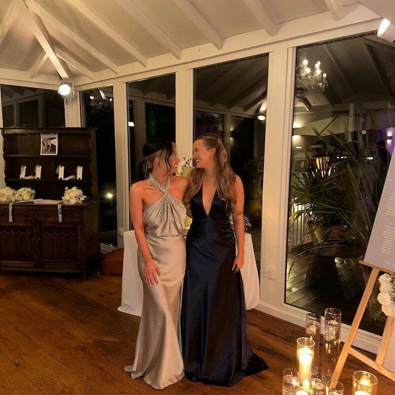 Make a sophisticated statement in this navy blue prom dress. Featuring a daring deep halter V-neck and a classic A-line silhouette, this luxurious satin formal gown offers timeless elegance. Why search for a prom dress nearby when perfection is one click away? Order your dream dress today!