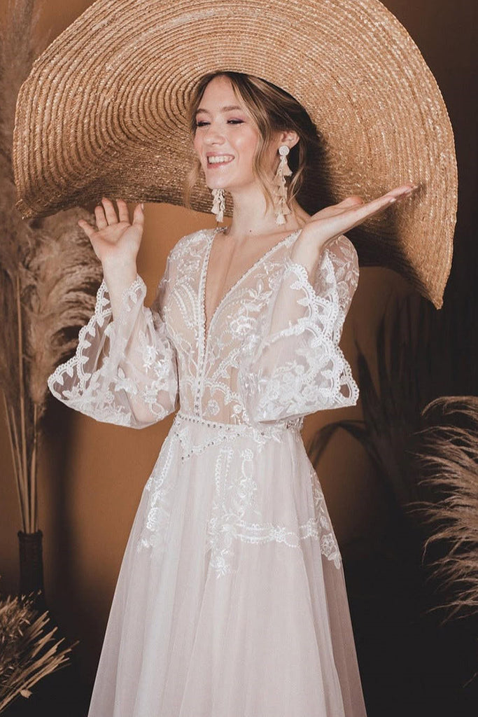 Achieve effortless glamour in this stunning elegant wedding dress! Perfect for your seaside celebration, this beach wedding dress features a flattering A-Line skirt for graceful movement in the breeze. The bodice includes a romantic V-neck and delicate lace detailing, complemented by airy flare sleeves. This gown balances sophistication with bohemian charm, ensuring a comfortable, beautiful, and utterly unforgettable walk down the aisle.